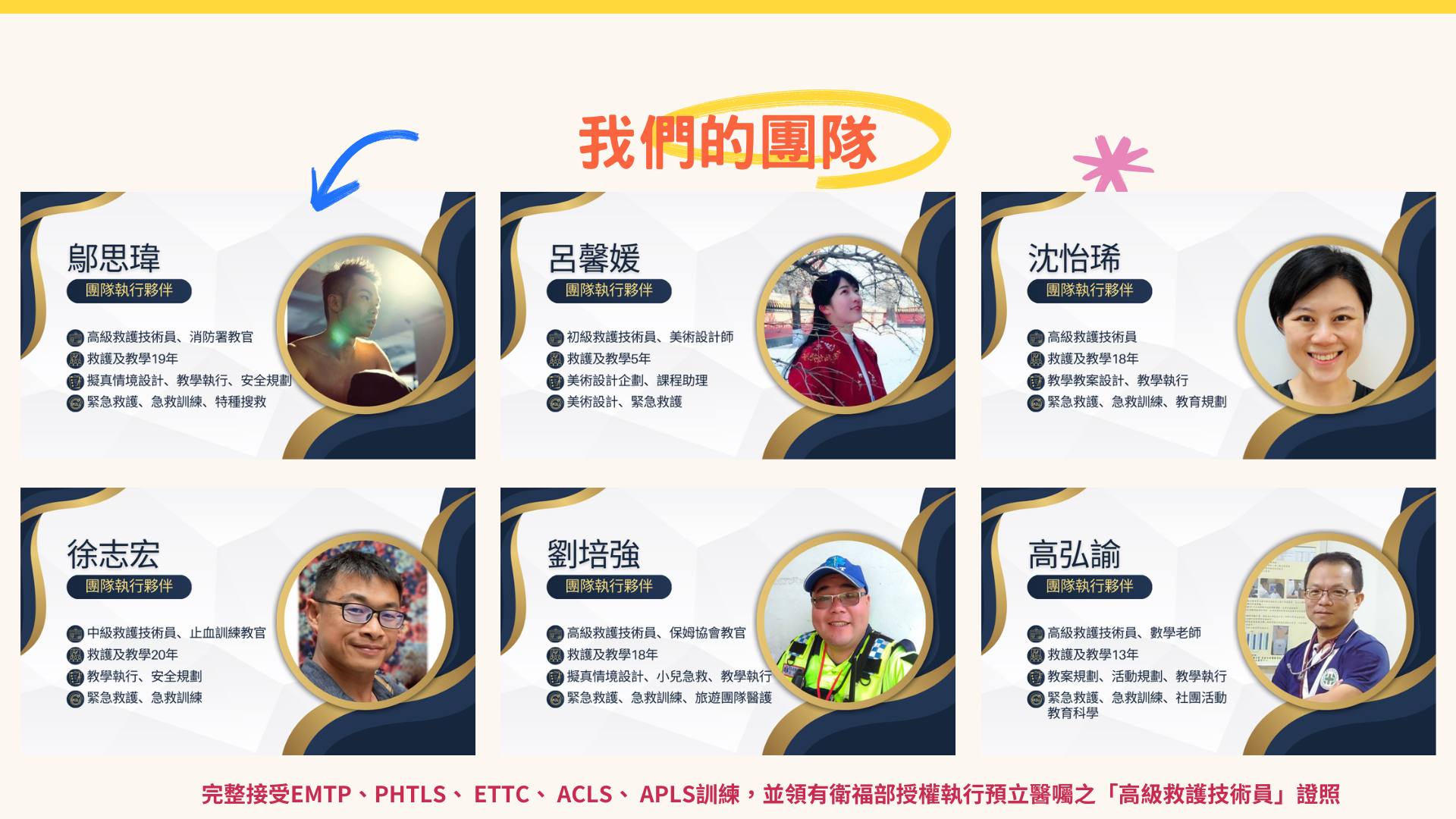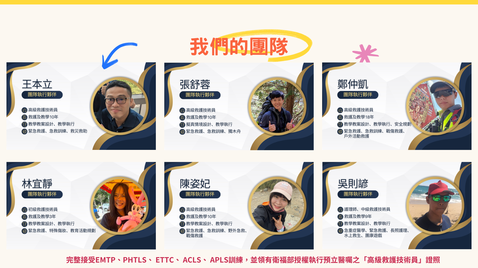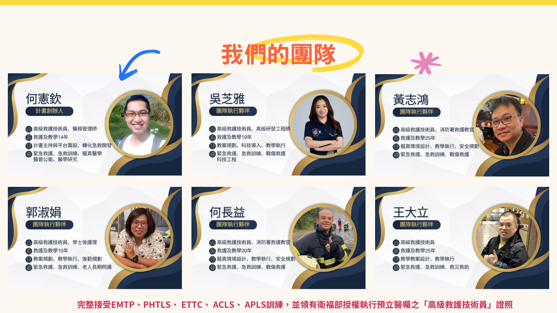 - 我們提供CPR、創傷急救(加壓止血、止血帶、骨折固定)這類最迫切需要的技能